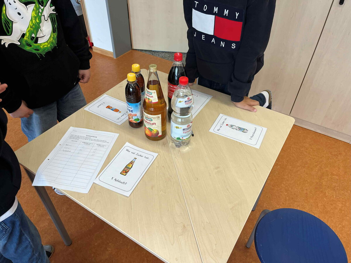 Die Lehrkräfte der 3. Klassen gestalteten eine ZUCKER - Austellung in der Mathe-Lernwerkstatt. Dabei sollten die Kinder schätzen, wie viel Gramm Zucker die jeweiligen Lebensmittel enthalten. Beim Überprüfen waren viele Schülerinnen und Schüler erstaunt, wie hoch der Zuckergehalt tatsächlich ist. Ein Schüler meinte: "Oh je, auf Apfelsaft werde ich zukünftig verzichten."